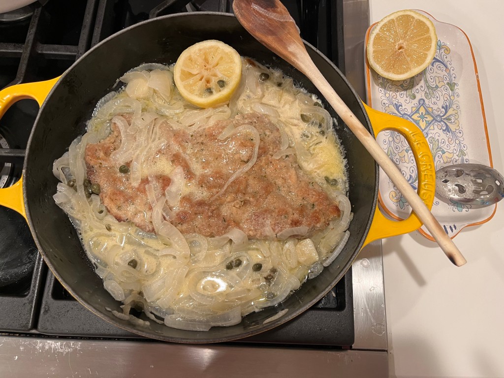 Add the cutlets to the skillet, pour some of the liquid and onions over all and cook until completely heated through, possibly turning the cutlets a few times in the sauce. At this point I like to add a few tablespoons of heavy cream. But that is totally optional. Place a thin lemon slice on each cutlet and keep the chicken warm, covered until ready to serve.