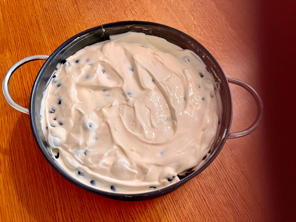 Combine drained sour cream, remaining 1/3 cup sugar, remaining tsp of desired extract, egg yolks and when well blended pour over blueberries.