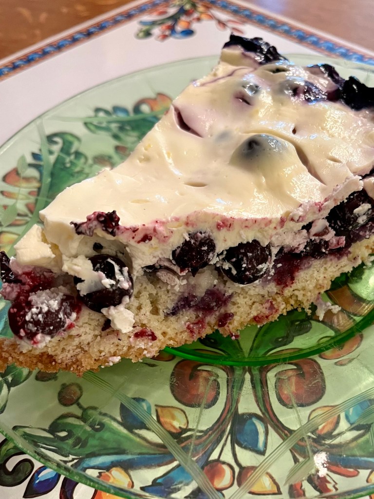 In a separate bowl add flour, baking powder, salt and mix until well combined. Add to the butter mixture and mix until combined. Spread evenly on the bottom of the pan and pat down smoothing it to the ends. Scatter blueberries all over the crust.