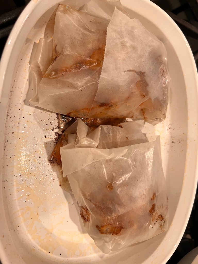 Charlie’s father was a day laborer, and his hours were dictated by the weather. He could arrive home any time from 5pm until 8pm. So, I had many special hours to spend with “Momma” while she cooked, and we waited together. Pleasantly and without realizing it at the time I was receiving private cooking lessons. My Mother-in-law was a resourceful cook who created delicious meals. And one of the most memorable is one that I remember mostly because the preparation astonished me: chicken baked in wax paper. It always turned out crisp, nicely browned, and moist….and like all of her dishes, truly delicious. Mother’s Day is approaching, and I was thinking about my Mother-in-law and this simple but delightful dish popped into my mind.