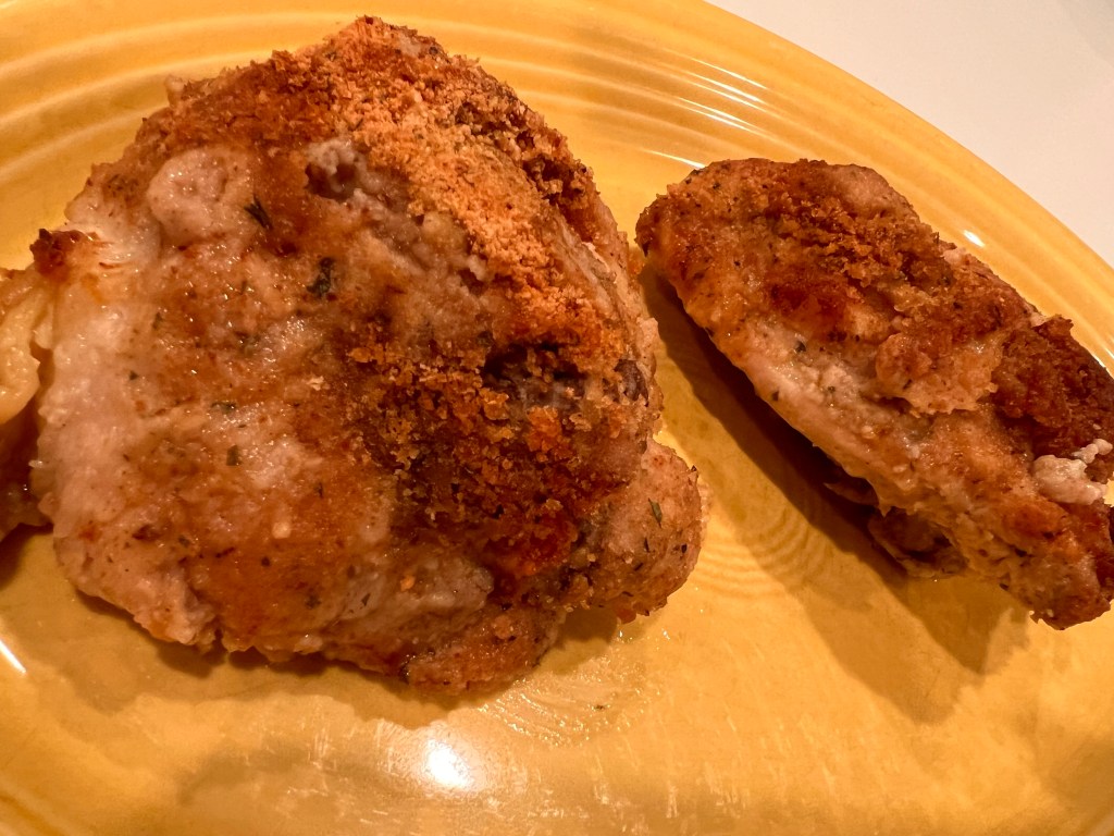 Each piece should be skin on and bone in, washed and patted dry. Sprinkle each with a slight amount of salt and pepper (a little garlic powder, for me), coat each piece heavily with Hellman’s mayonnaise*, dip in seasoned breadcrumbs, sprinkle slightly with Romano cheese, freshly grated, and enclose each piece separately in wax paper. Place on a heavy bottom baking sheet and bake for 35-45 minutes or until a meat thermometer declares the chicken fully cooked. Remove from oven and let sit undisturbed for 5 or 6 minutes. Carefully unwrap so as not to disturb all the breading and serve.