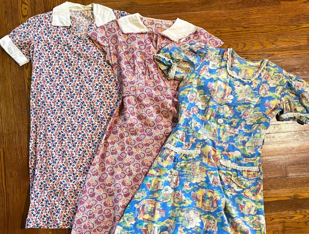 Feed sack dresses, flour sack dresses, or feedsack dresses were a common article of clothing in many communities in the United States from the late 19th century through sometime into the 20th century. These dresses were made at home, usually by mothers and grandmothers, using the material from the cotton sacks in which flour, sugar, animal feed, seeds, and other commodities were packaged, shipped, and sold. They became a fitful part of life in some areas from the 1920s through the Great Depression, World War II, and post-World War II years. The mantra was “cloth is scarce, handle with care”.