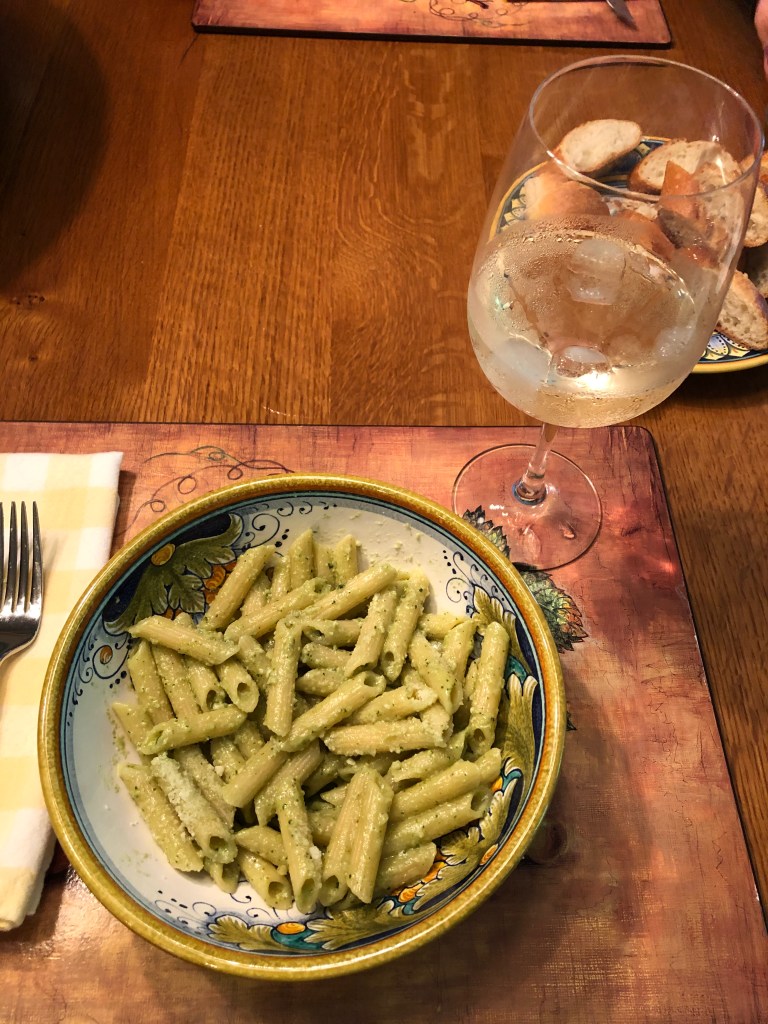 | Basil pesto is actually a relatively modern pasta sauce compared to others. It was invented in Genova, Liguria in the 1800s. In fact, it’s usually referred to as pesto Genovese. Before they invented pesto, the Genovese often ate their pasta either cooked in broth and sprinkled with cheese or seasoned with condiments such as prescinsêua cheese (a cross between yogurt and ricotta), normal ricotta and cinnamon or sauces of mushrooms and hazelnuts. The first time I ever tasted basil pesto I was in the countryside of Torino, Italy. I think it might have been Castelnuovo Calcea. I was a teenager visiting Italy with my parents and younger brother. We were visiting my mother’s uncle who had 9 children and of the dark haired 9, one was a blond and one was a redhead. Some were married so the gathering was outside and we were all sitting at a long wooden table or maybe it was two joined together and we were sitting on benches. The day was cool even though it was June, we were up in the mountains surrounded by farmland. I can close my eyes and remember the day distinctly as if it were just last week. The sky was blue with just a few clouds and as we ate, I could hear their cow mooing in the nearby pasture. Anyway, for Cena we were served their homemade pasta with, a surprisingly for my brother and me, very green sauce. That was my first introduction to pesto, any variety of pesto. But for many reasons it is a favorite of mine to this day and we always have basil planted in pots near to our kitchen as I have many uses for it in my cooking along with the luscious pesto. Because my mother had not seen her family for over 45 years the talk was rapid and endless. I didn’t speak much Italian, but I could understand most of it. It was a glorious day and because we were up so high the air was cool and crisp. Unfortunately, if any pictures were taken on that day (which I doubt because we only had an old Kodak that took rolled film that had to be sent away to be developed) they are lost to me. My husband and I went back to visit the area a few years ago but couldn’t locate the little village outside of Castelnuovo and I was amazed at how much building had taken over some of the farmland. I think mostly for wineries. But the memories of that day are still crystal clear |