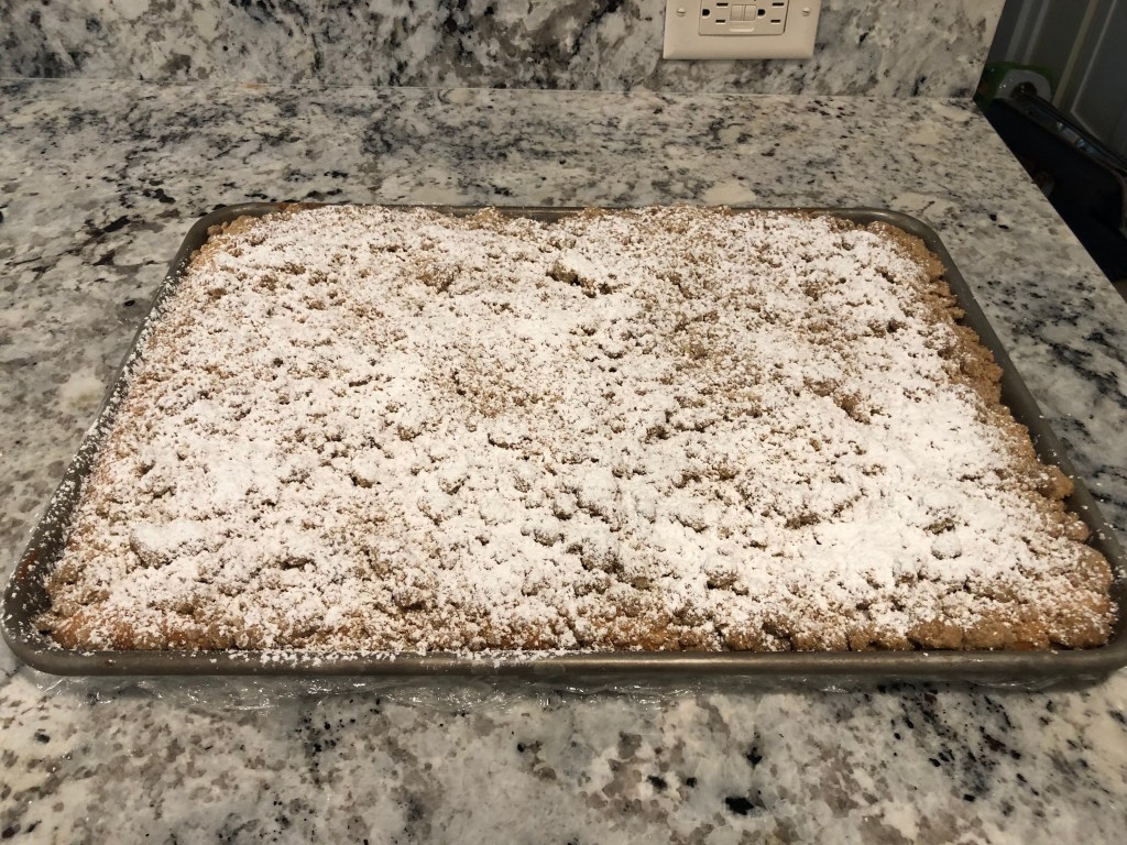 Mix dry ingredients and blend with cooled butter using a fork. Grasp by handfuls and crumble on top of batter. Bake at 350° for 30 – 40 minutes. Cool and sprinkle with powdered sugar. Cut into large squares.