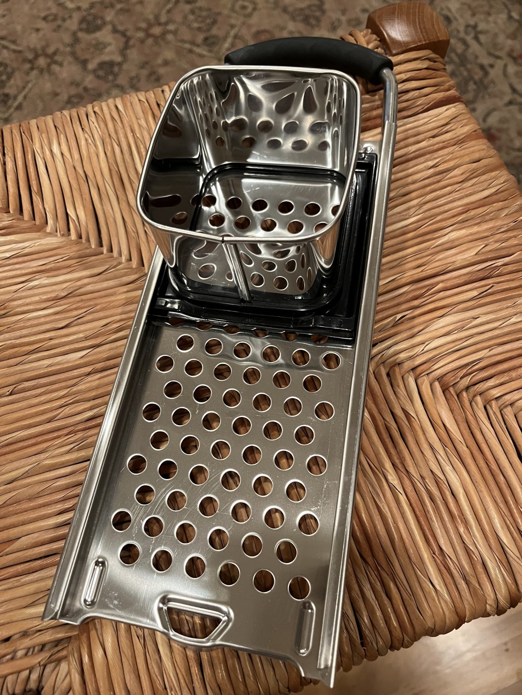 NOTE: I find that it helps to have a second person handy to stir while I slide the cup back and forth and then refill the cup with more batter. As soon as you have finished with the spaetzle maker soak it in hot soapy water which will make it a lot easier to clean. Otherwise, the batter might adhere like glue! I have also seen this done without a spaetzle maker by pouring the batter into a funnel and as it slithers out above the water it is cut with scissors at the desired length.