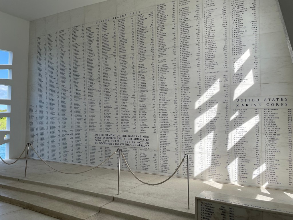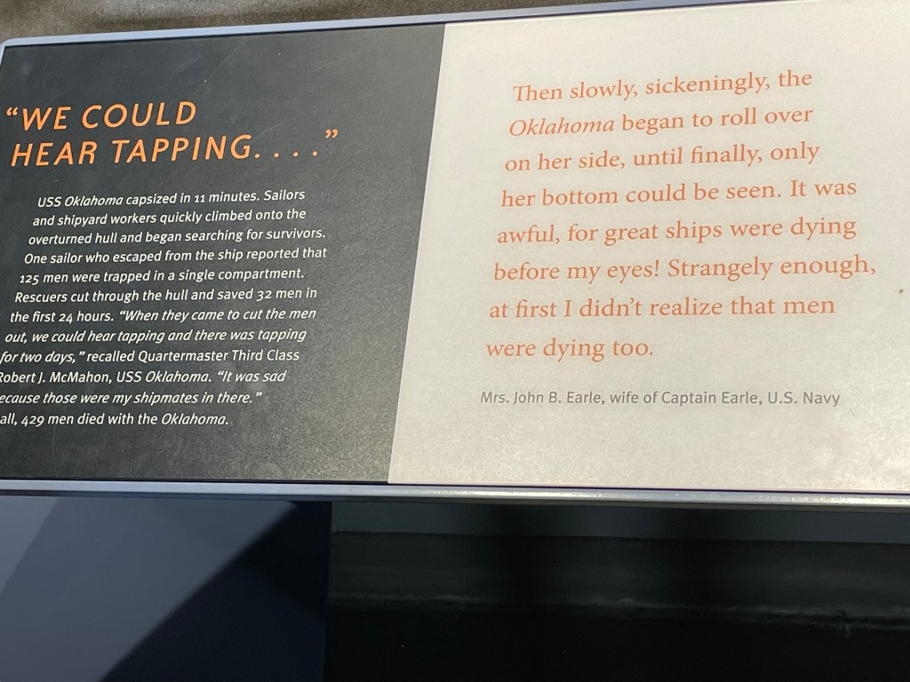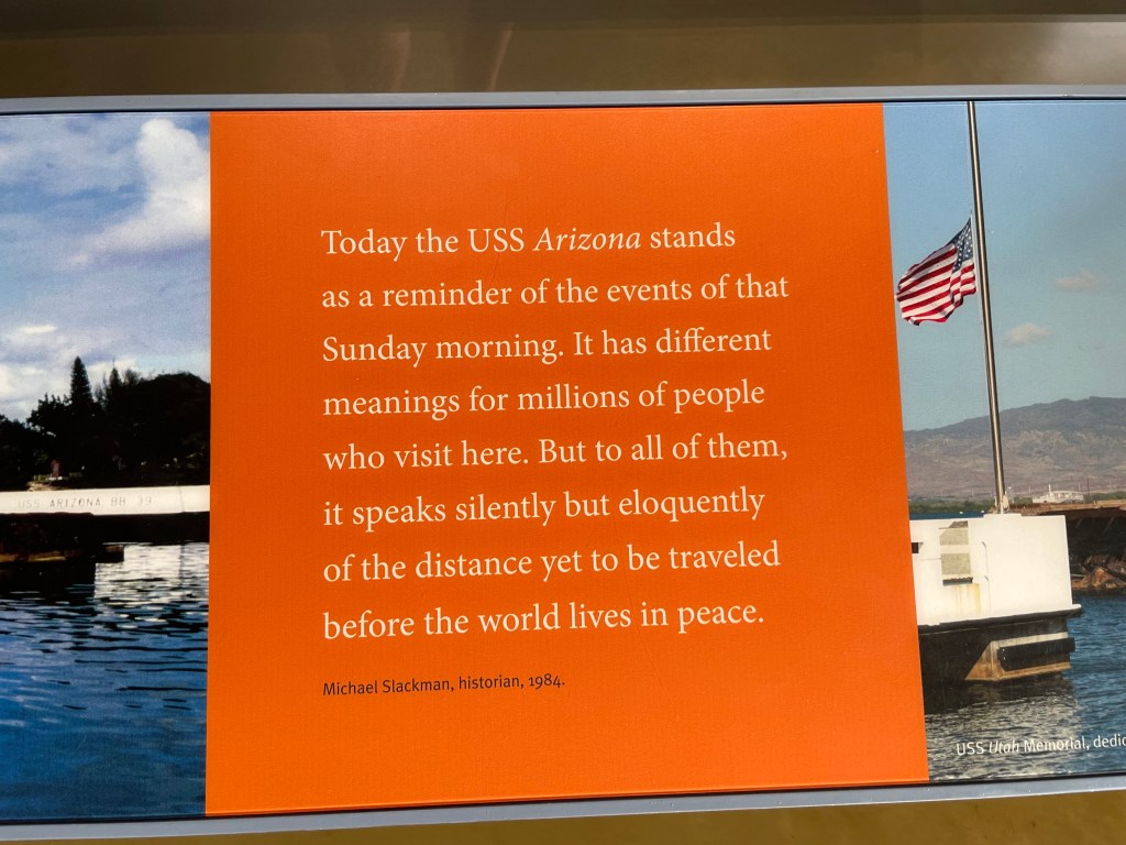 Upon arrival at Pearl Harbor, we are first introduced to the events with a film that was remarkably put together because of security cameras that were hidden throughout the island. The quiet in the theater is eerily noticeable except for an occasional sniffle. Noticeably too, many are wiping their eyes. How could we not be affected emotionally by this movie. The minute the Arizona explodes so do gasps and then again quiet as it continues to the end.