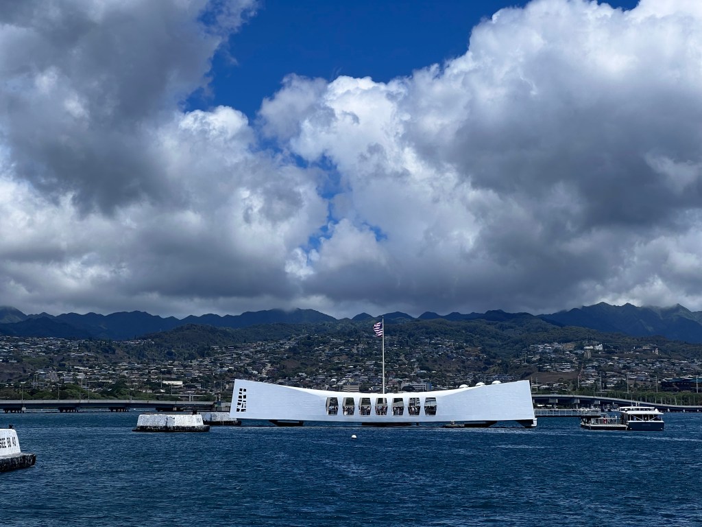 Maybe the weather which is dull and dreary now seems too appropriate for the day we are about to begin. Several of us are awaiting a tour bus that will take us to Pearl Harbor. Everyone is quiet in their own thoughts. Pearl Harbor is a solemn, sacred, site for Americans, and the seriousness has begun to set in as we board and travel. We have an excellent tour guide who quite remarkably manages the morning traffic and speaks, almost non-stop, discussing what we will see today and also, he is a wealth of information on trivial facts along the way.