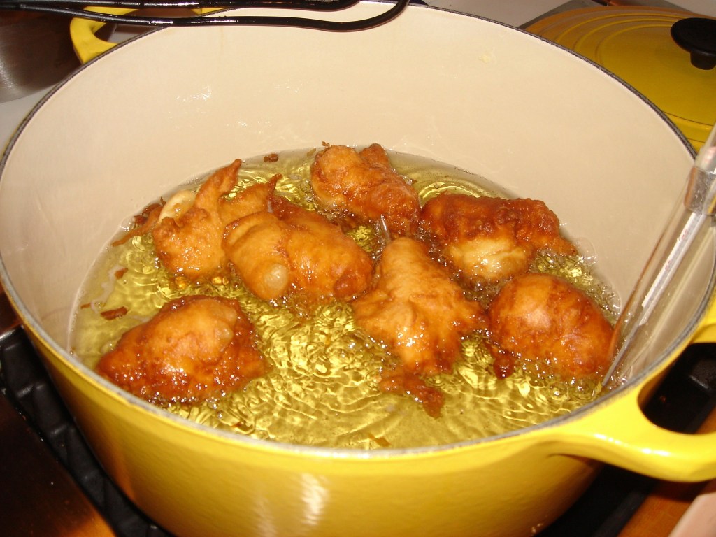 Note: This is a Sicilian treat that I learned from my Mother-in-law. For our first Christmas in our house in Smithtown and, as an inexperienced cook, I wanted to surprise everyone at dessert time. I made several batches and carefully put them in an airtight container to preserve until dessert. When I opened the container all that was in there was a soggy mess in a sea of oil. Sfingi must be eaten right away. Big disappointment for the new cook trying to impress family and namely, in-laws.