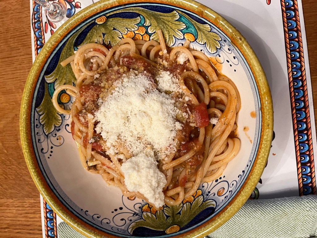 Bucatini is a fun one to serve when the little grandchildren are with us. Of course, bibs and a warm washcloth are handy to have near-by!
