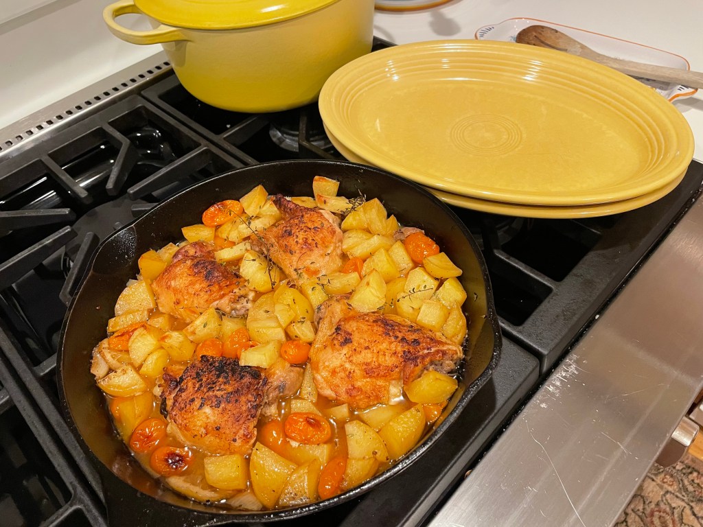 Cut the chicken breasts into pieces. Remove the seeds from the pepper and slice each into 8 pieces. Sauté the chicken in the olive oil in a large skillet, together with the garlic and rosemary. Cook for about 3-5 minutes. Add the wine and simmer until it has almost evaporated. Add the onions and peppers and cook for 6-7 minutes more on medium-high heat. Taste for salt and pepper and adjust. Add the tomatoes and continue cooking for a few more minutes. Until the tomatoes are soft and have released their juice.
