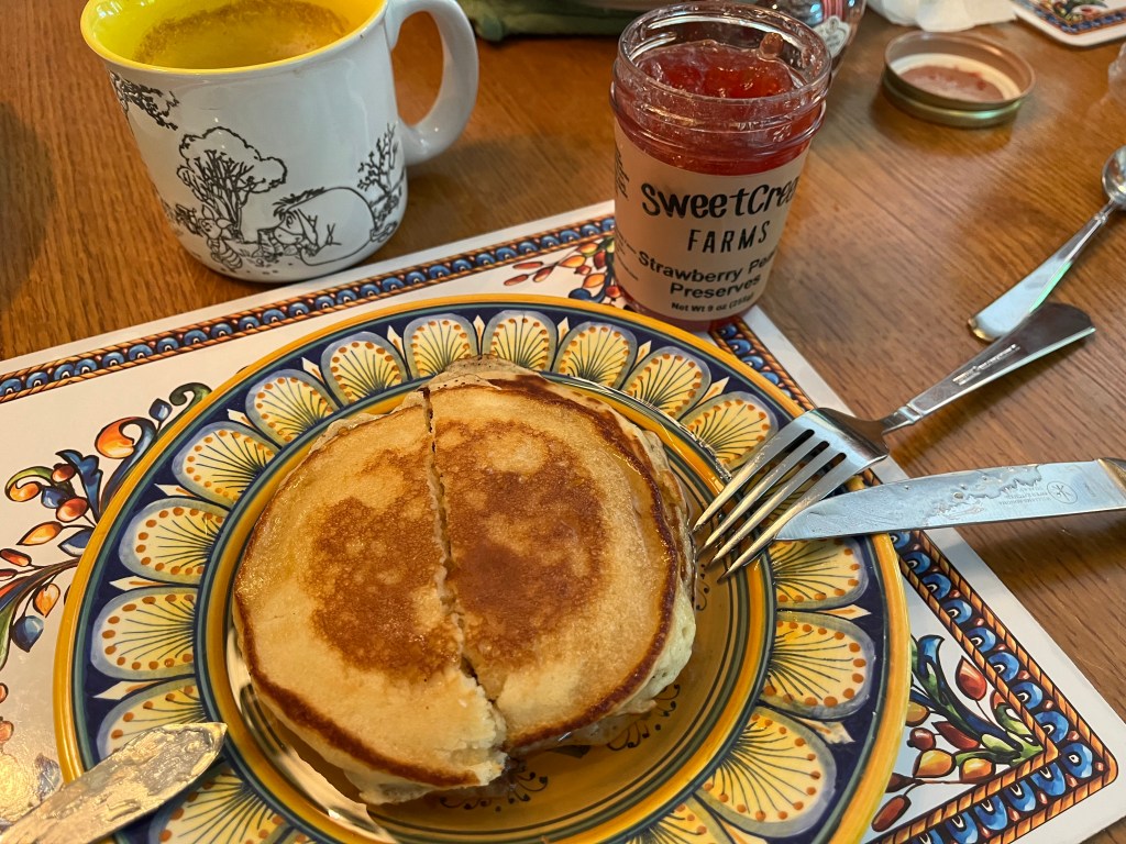 Pour ¼ cup of batter on to a preheated hot buttered griddle. Cook for 3-4 minutes or until the tops of the pancakes have bubbles and the edges are getting slightly toasted. Turn and cook for an additional 3-4 minutes or until they are cooked in the middle and not runny. Place in a single layer on a baking sheet in a warm oven. Serve with the following recipe for a Cream Cheese Syrup or your favorite syrup.